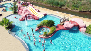 Un vaste parc aquatique de 550 m² est accessible en saison : 3 toboggans, une rivière de 40 m avec courant et jets massants, un bassin chauffé de 100 m², cascades, jacuzzi, pataugeoire ludique pour les enfants.